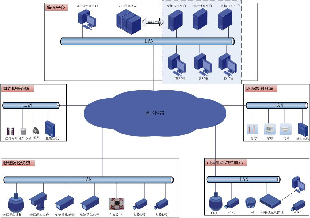 從用戶需求出發(fā),以夯實視頻應(yīng)用為目標,利用先進技術(shù)充實前端采集的深度,后端應(yīng)用的廣度。本次設(shè)計以高點監(jiān)控為核心,通過360度大范圍視頻采集,形成對園區(qū)全方位無死角覆蓋;利用先進的AR增強現(xiàn)實技術(shù)擴展基于視頻的深度應(yīng)用。